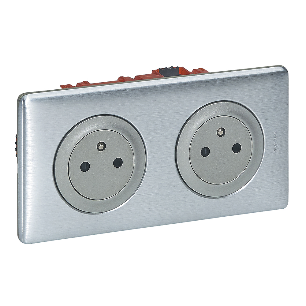 Kit double prise de courant Surface 16A précâblée Céliane avec boite d'encastrement 2 postes et plaque de finition Alu - prêt à installer
