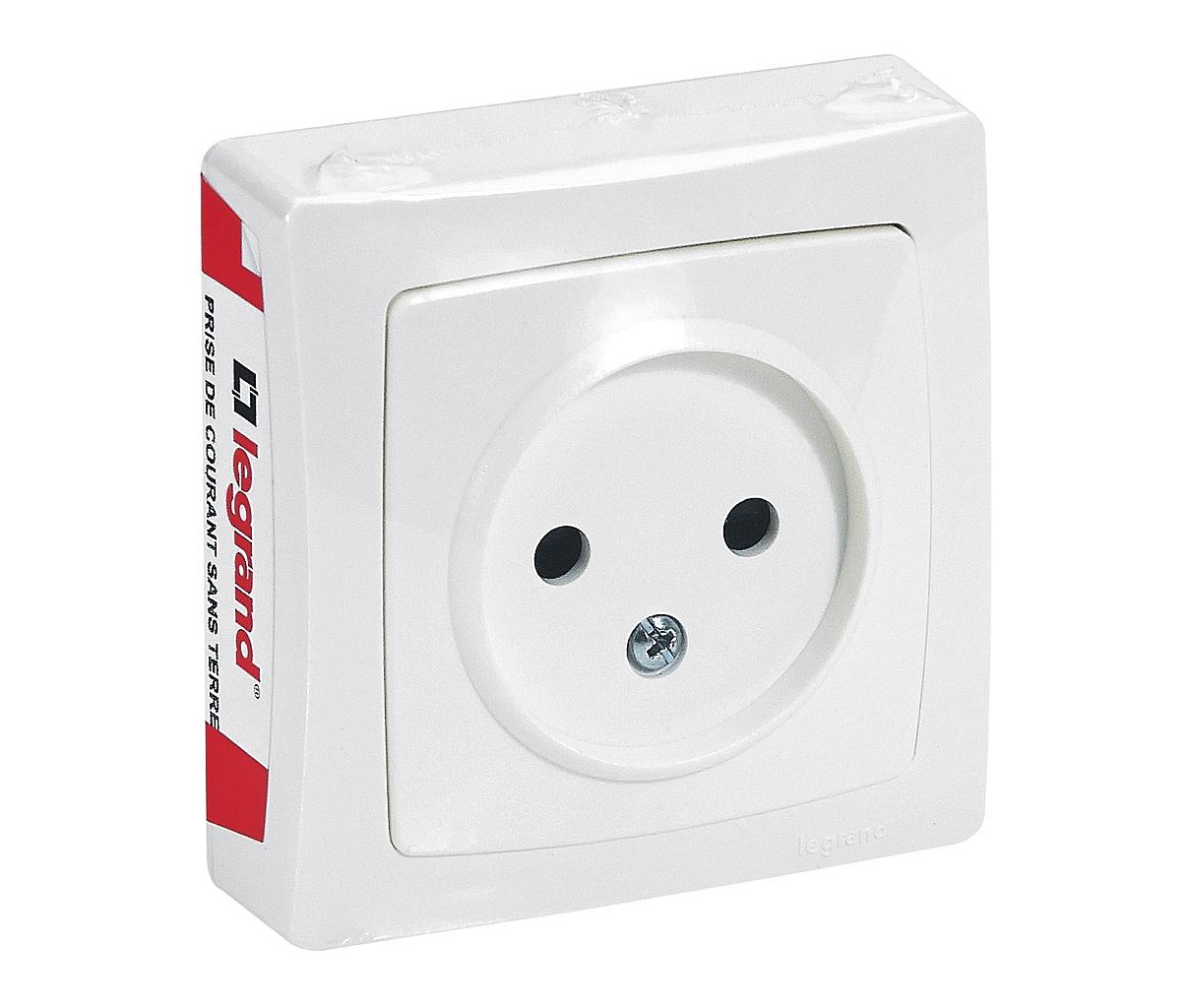 Prise de courant sans terre Appareillage Saillie avec connexion par bornes à vis livrée complète prête à poser en finition blanc - version film