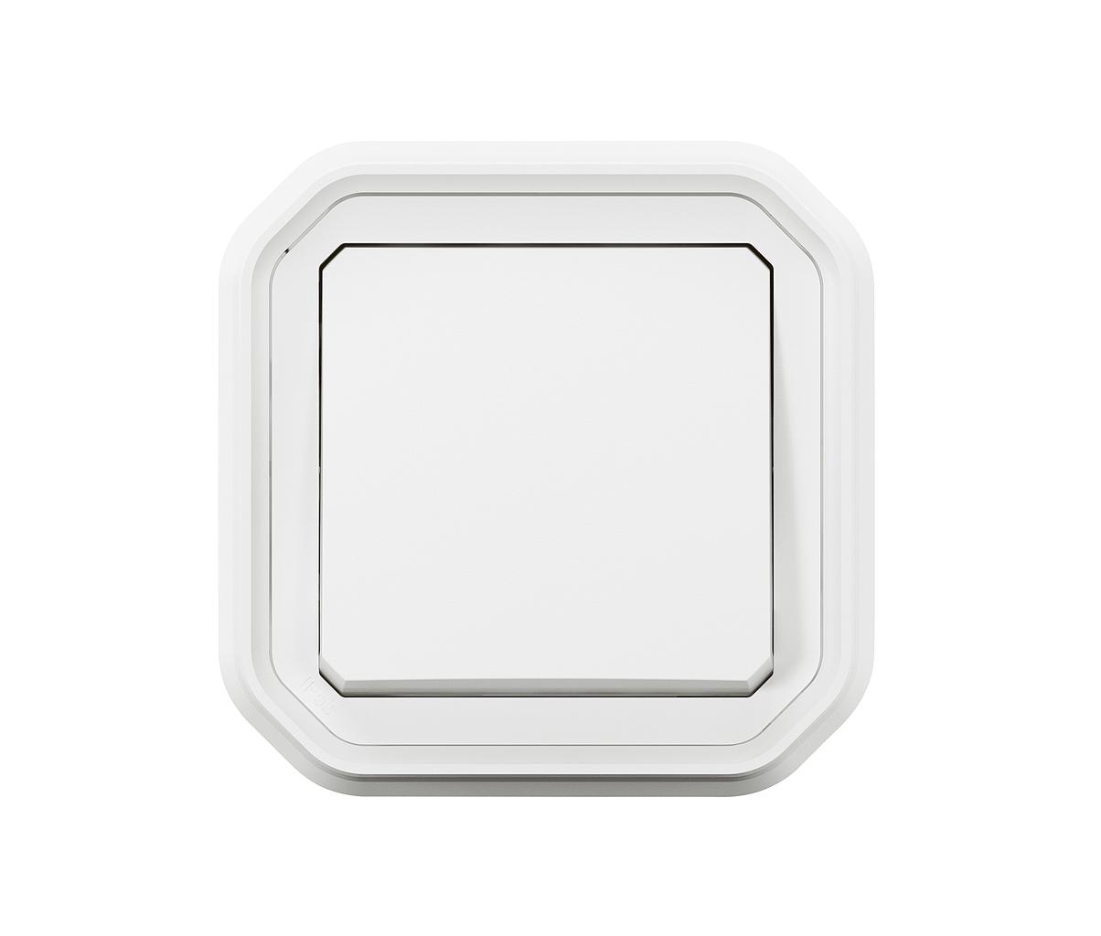 Interrupteur ou va-et-vient étanche IP55 Plexo 10A livré complet, prêt à installer avec support plaque pour montage en encastré avec griffes fournies - blanc