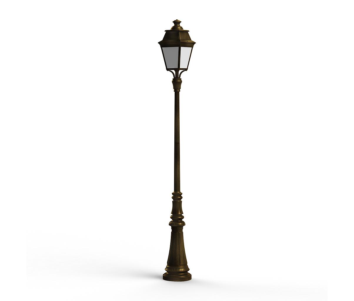 Lampadaire 1 tête AVENUE 3 en aluminium, LED 35W 3000°K, IP44, classe 1, diffuseur méthacrylate opale. Finition Patine dorée 009. Garantie 25 ans anticorrosion sur l'aluminium